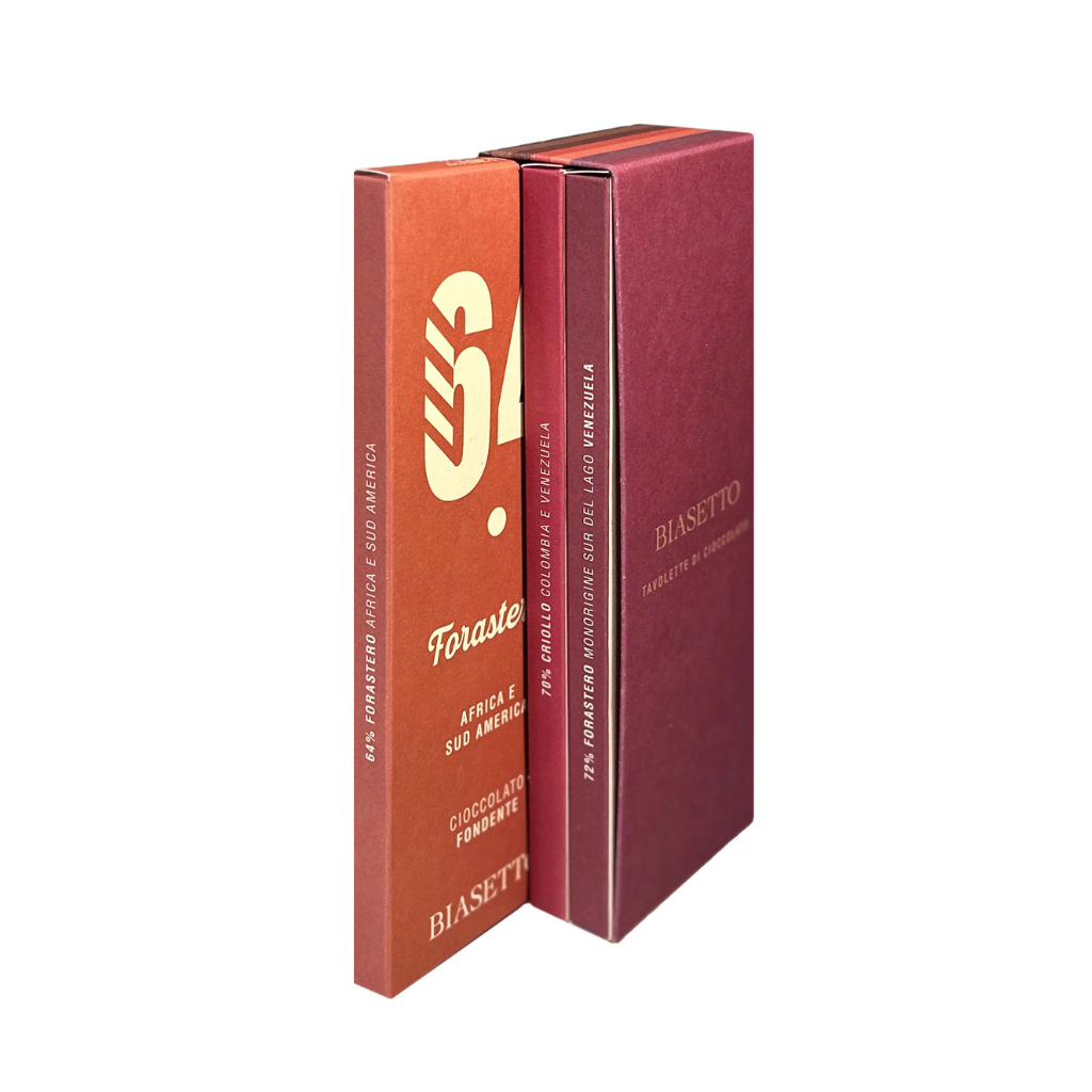 La Box di cioccolato permette di scegliere tre tavolette dal nostro assortimento, creando un percorso di gusto unico e su misura.