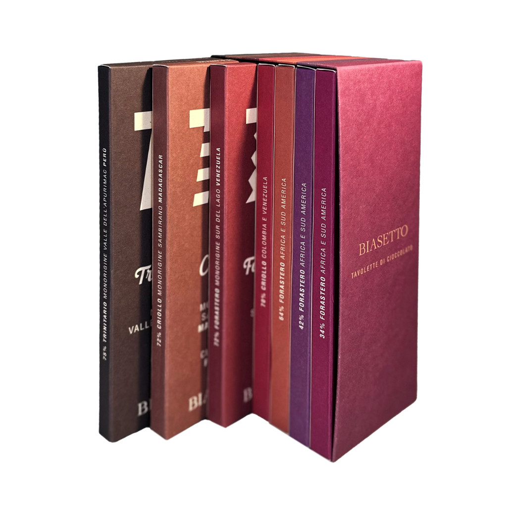 La Box di cioccolato permette di scegliere sette tavolette dal nostro assortimento, creando un percorso di gusto unico e su misura.
