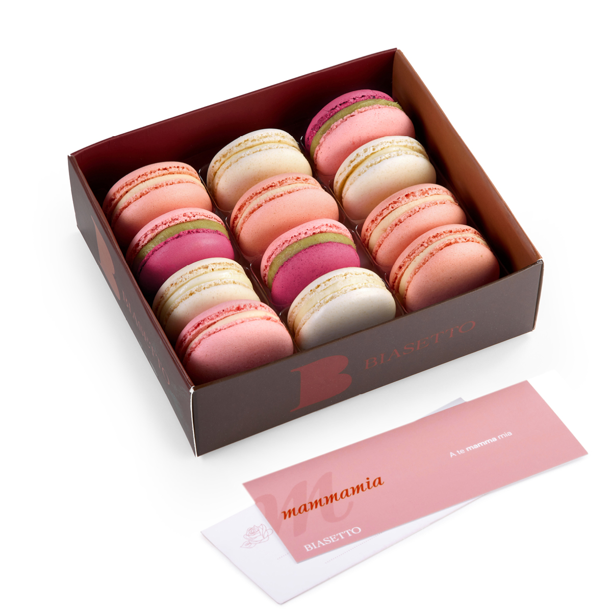 Racchiusi in un elegante scatola di macaron assortiti con 6 gusti della collezione classica: vaniglia e rosa e 3 macaron dedicati alla Mamma.