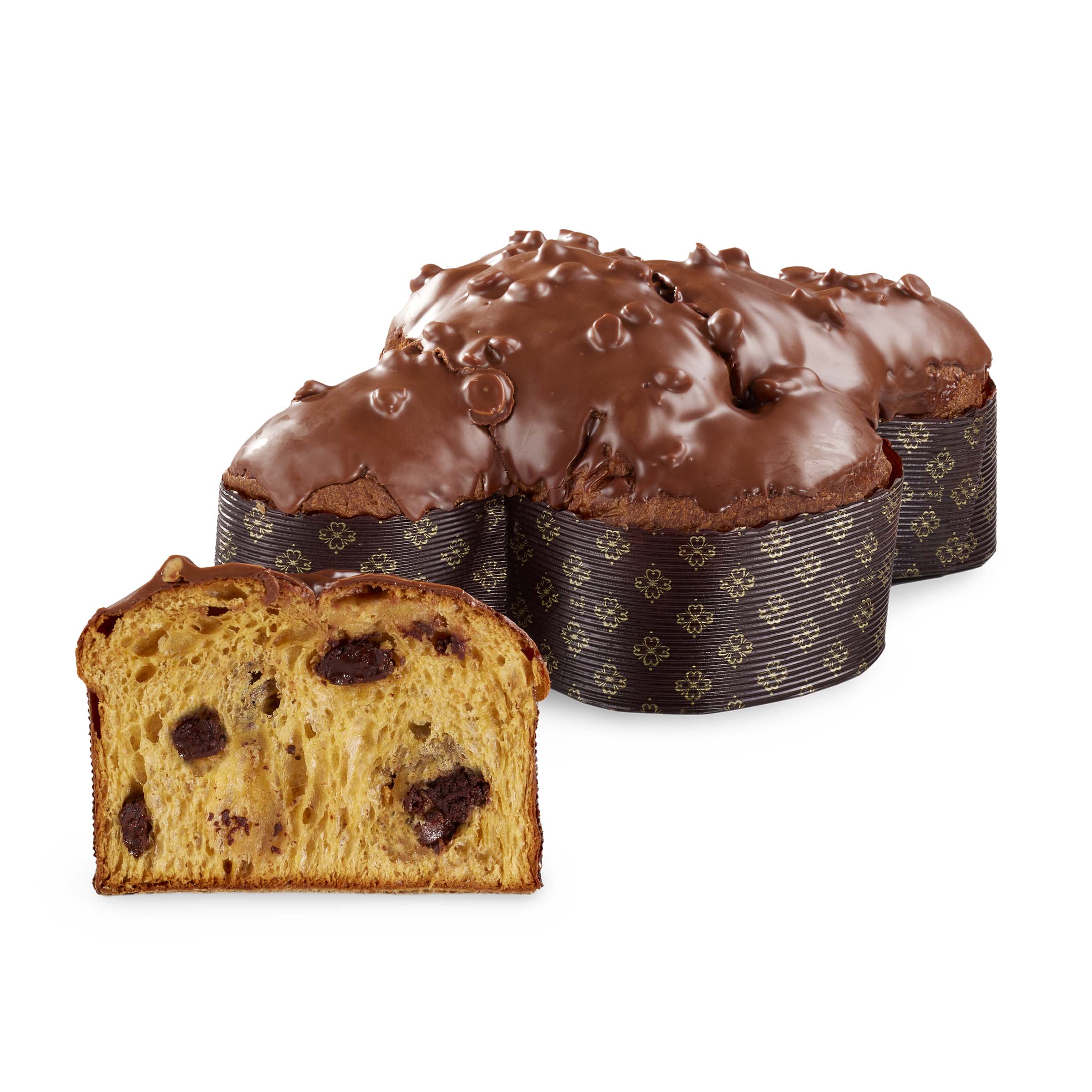 Un soffice impasto alla gianduia con cubetti di cioccolato, glassato e impreziosito da nocciole, la cui superficie pavé brilla come gemme incastonate nella roccia.